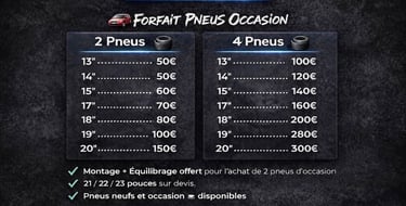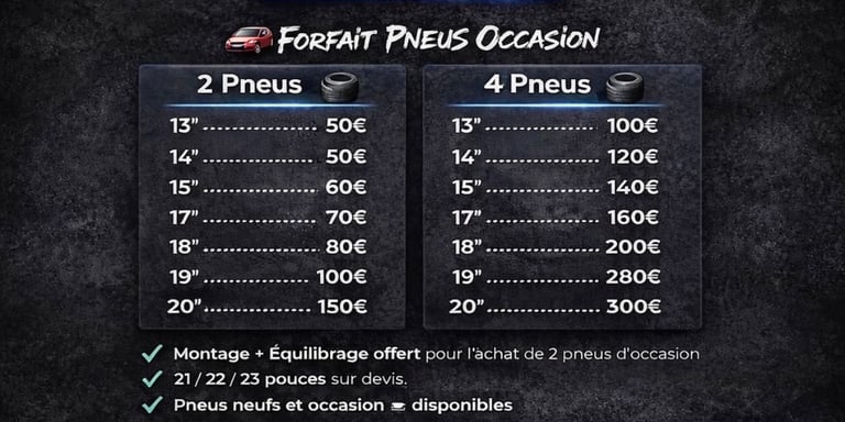 Montage + équilibrage offert pour l'achat de 2 pneus · 21/22/23 pouces sur devis · Pneus neufs et occasion disponibles